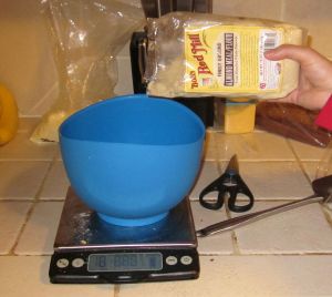 After whisking the eggs, measure the almond flour (I used Bob’s Red Mill) and powdered sugar. I like to use a kitchen scale for accuracy.