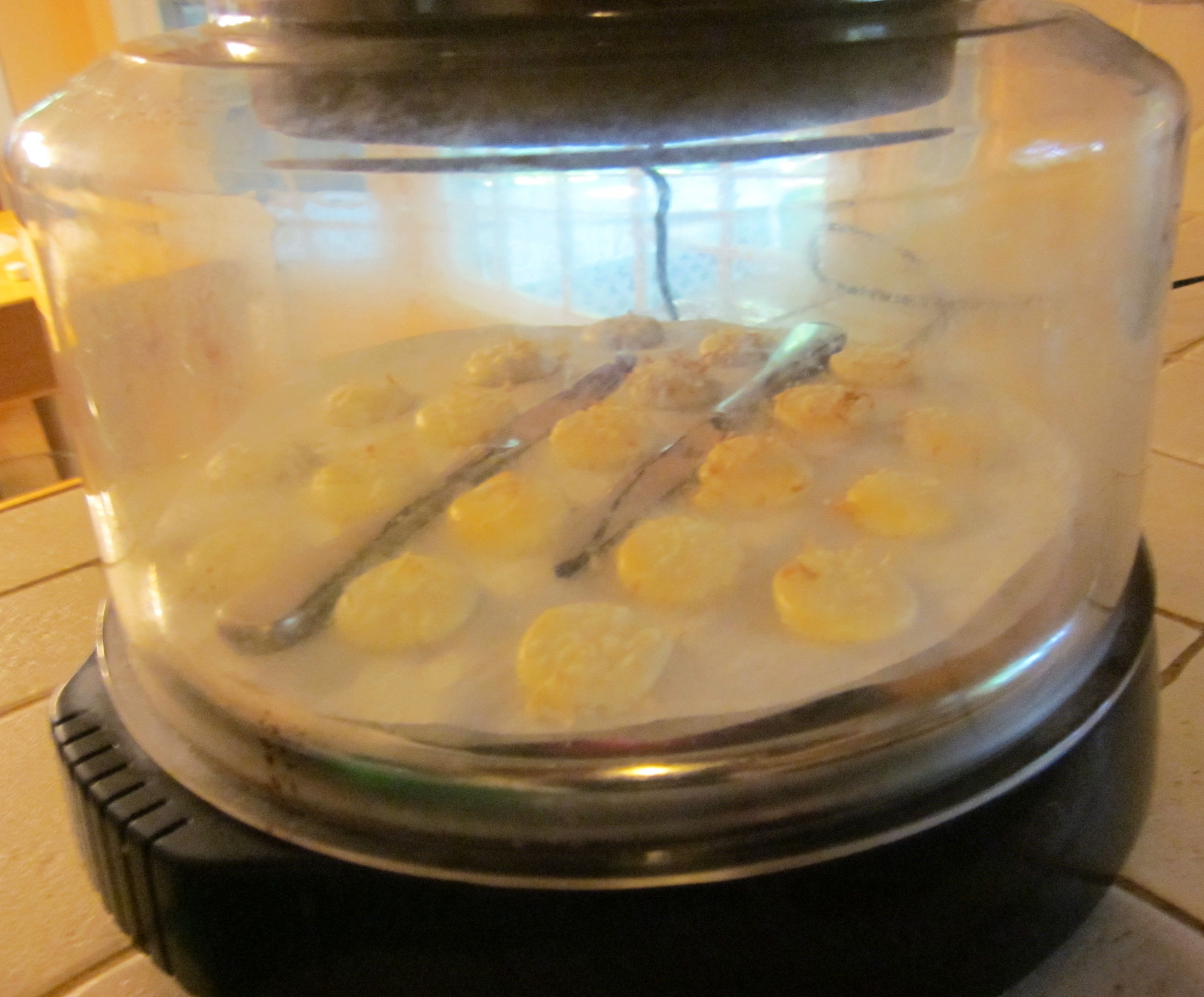 After piping them sprinkle them with coconut. Let them sit for about an hour so they have a slight crust on them. The first time I made these I cooked them in an oven on Silpats at 280°. I got pretty good results, but I made the mistake of putting both cookie sheets in at the same time. I wanted to try my Nuwave oven this time since it seems more like a convection oven. It took me about 3 tries before I got the best results. the best batch was at power level 7 (275°) for 12 minutes. The butter knives are just to keep them from getting sucked into the fan.