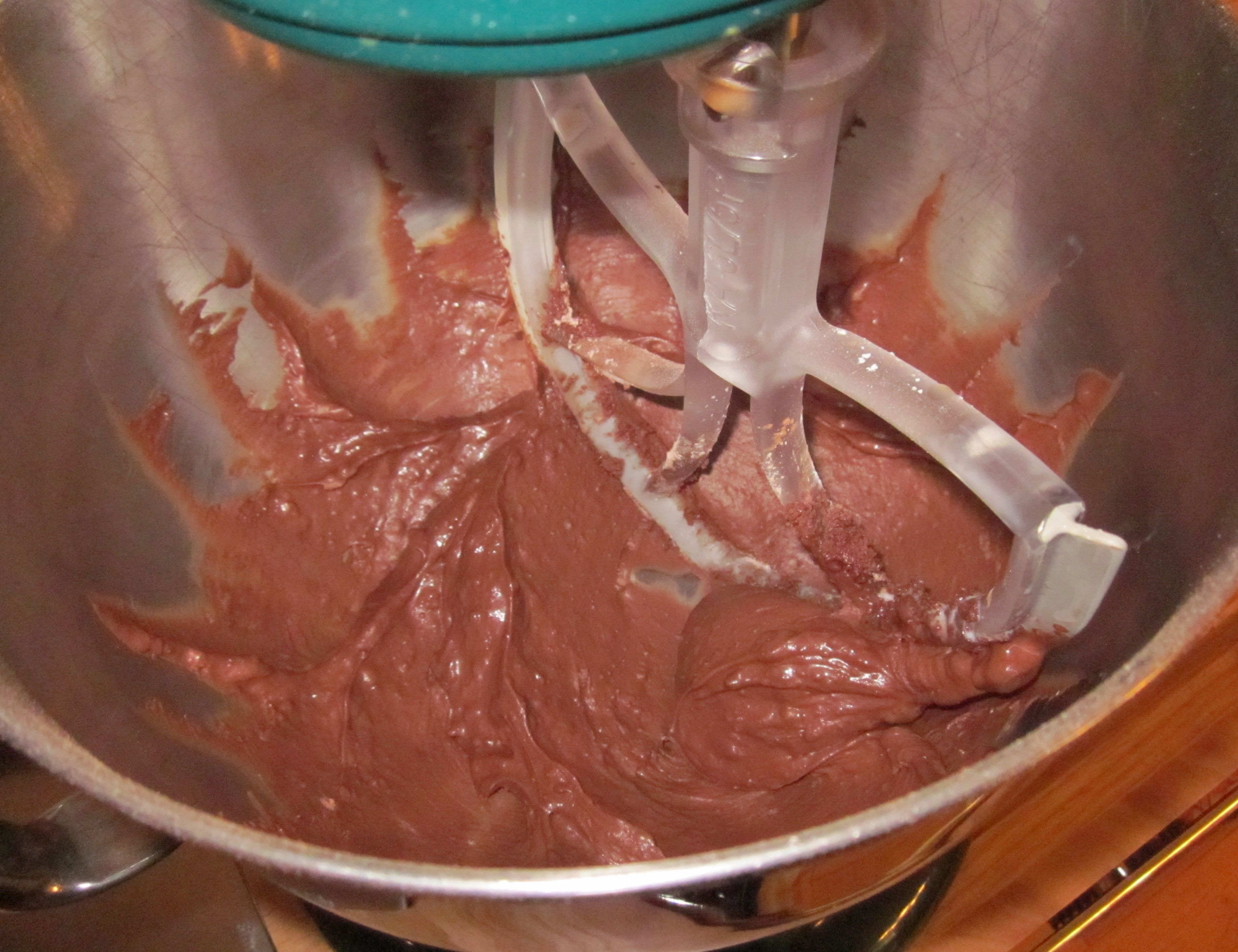 After cooking them, one sheet at a time, cool completely. After they cool loosen them and turn them all over. Prepare the chocolate buttercream filling. Allow the butter to soften then cream it in a mixer. Then add the remaining ingredients and blend well in a mixer.
