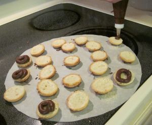 Scoop the filling into another icing bag and use the big round tip again. Pipe a good sized ring onto half of the cookie rounds and top with another round of similar size.