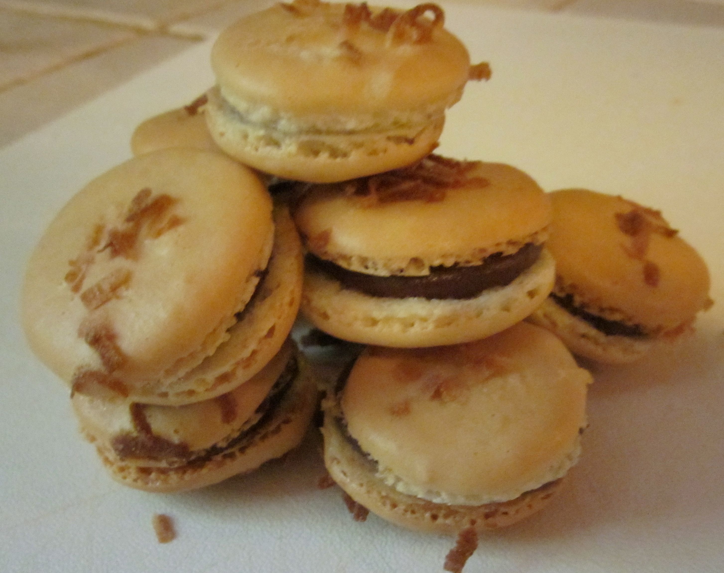 Today I made French macarons sprinkled with coconut and filled with chocolate buttercream. This is only my 2nd try at making macarons, but I thought they came out very nice.