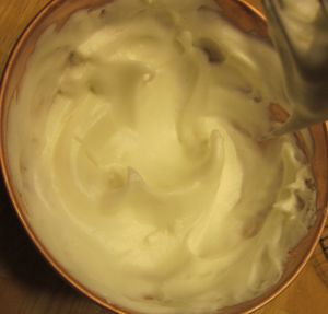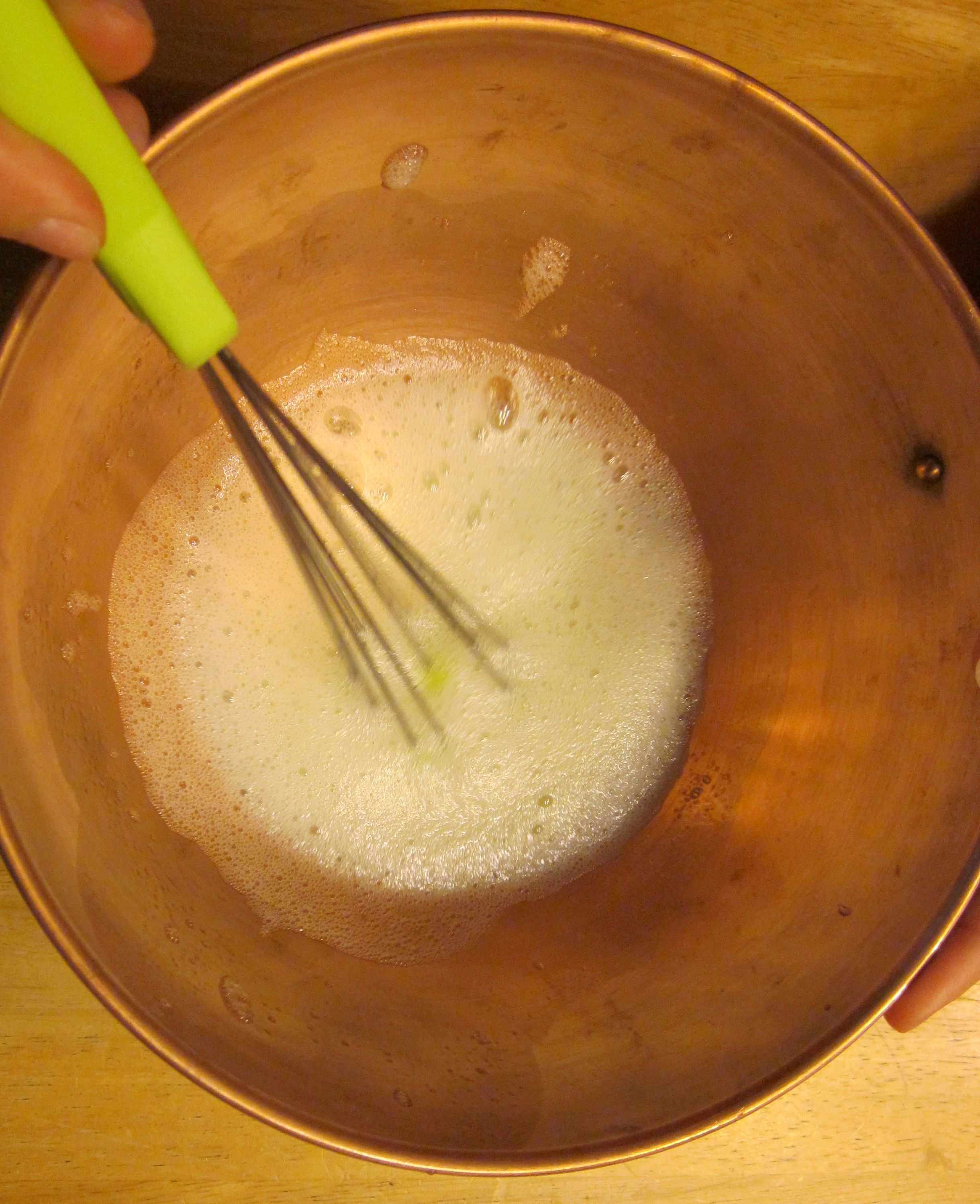 Separate the egg whites, cover them, and let them get to room temperature (I vacuum sealed them and left them on the counter overnight). Whip them in a copper bowl for several minutes until they start to get foamy. You don’t have to use a copper bowl, but I read that it makes the best, stable meringues so I thought it was worth a shot.