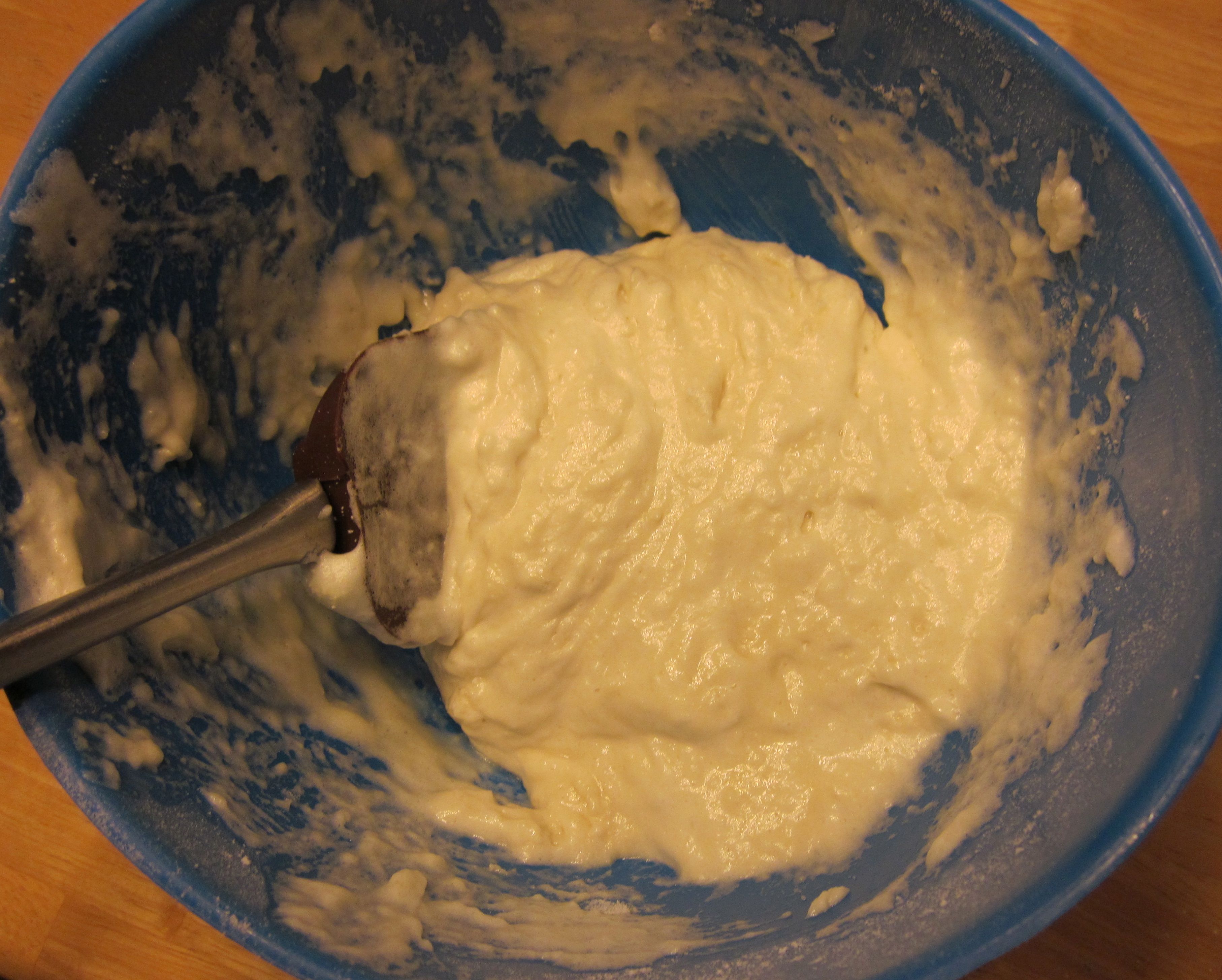 Combine the eggs and flour and mix lightly. The eggs will deflate which seems like all the whisking work is going to waste, but for some reason they come out light.