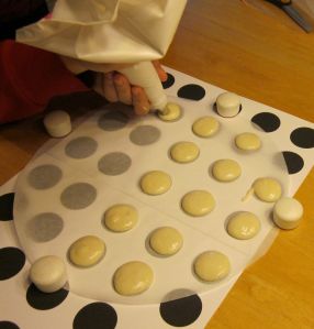 Transfer the mix to a piping bag using a large round tip and start piping them onto parchment paper. I used circles that were about 1 1/2″ in diameter. My daughter piped them out and she got about 80. By the 4th sheet she was pretty proficient. Some were amoeba shaped and they were sporadically bigger and smaller, but I found that it didn’t matter since you can probably find another one about the same size. Here is the printout for my guide. Macaron Template