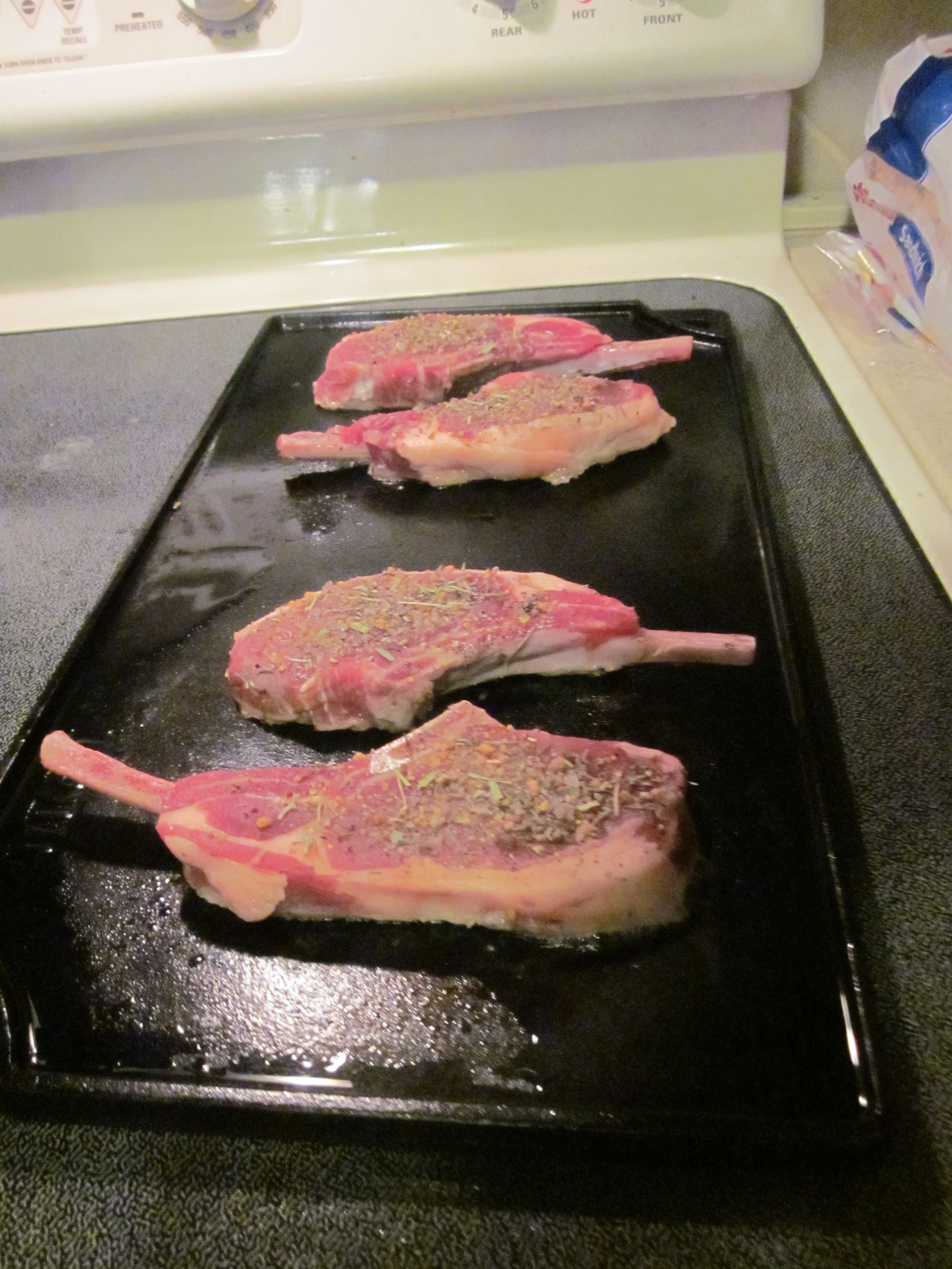 Sprinkle the boar with garlic, salt, pepper, and herbs. Cook on a hot griddle about 2 -3 minutes per side.