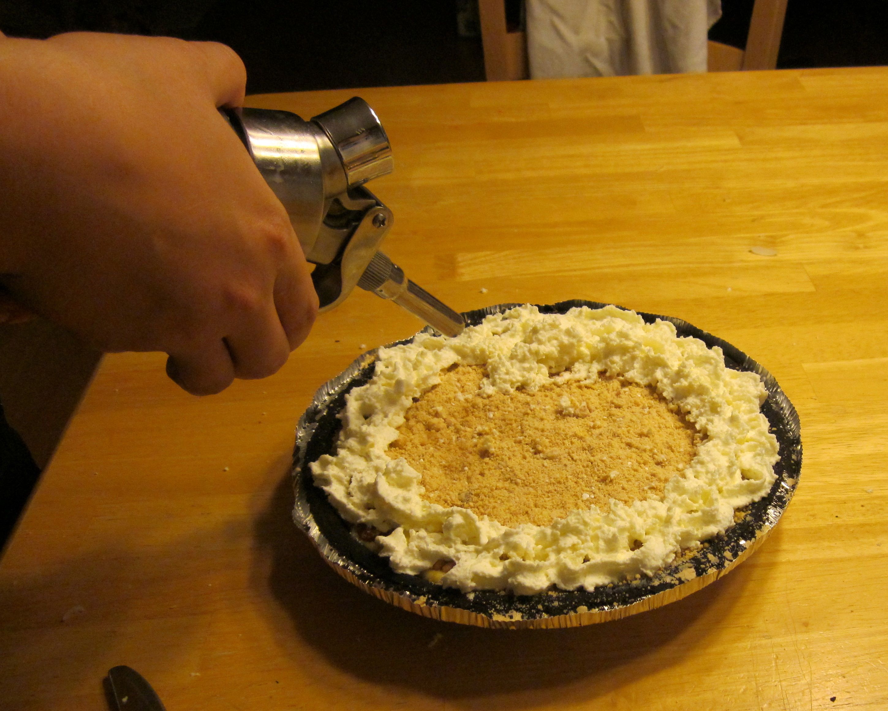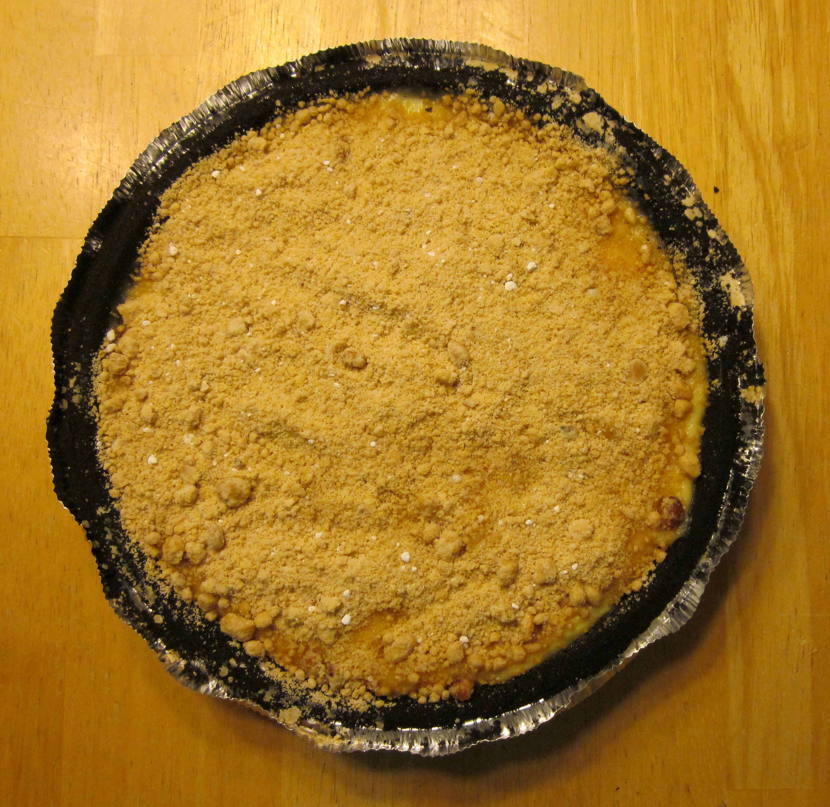 Layer 1/2 of the peanut butter crumbles into the shell followed by the pudding and the remaining crumbles.