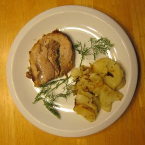 Put the oil, onion, and garlic into a large skillet. Cook on medium until soft. Add the potatoes, lemon juice, herbs, salt, and pepper. Cook through and lightly brown. I usually leave the lid on until they are starting to get soft, then brown them with the lid off.