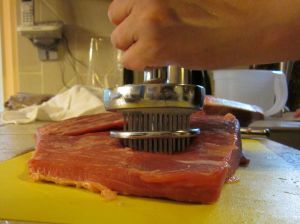 Trim fat from brisket and hit it several times on each side with a meat tenderizer.