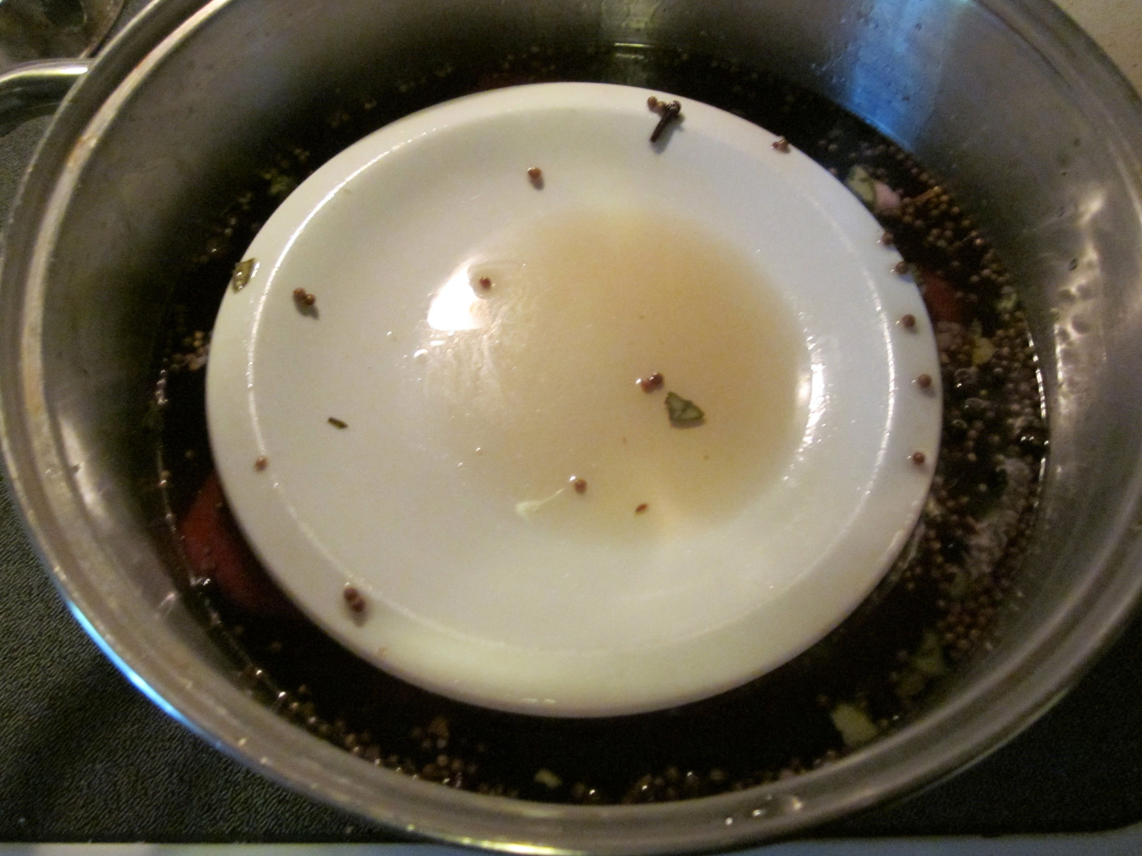 Place beef and brine in a non-reactive container (stainless steel, glass, or plastic). You can also use a Ziploc bag. Weigh the beef down with a plate to keep it submerged.