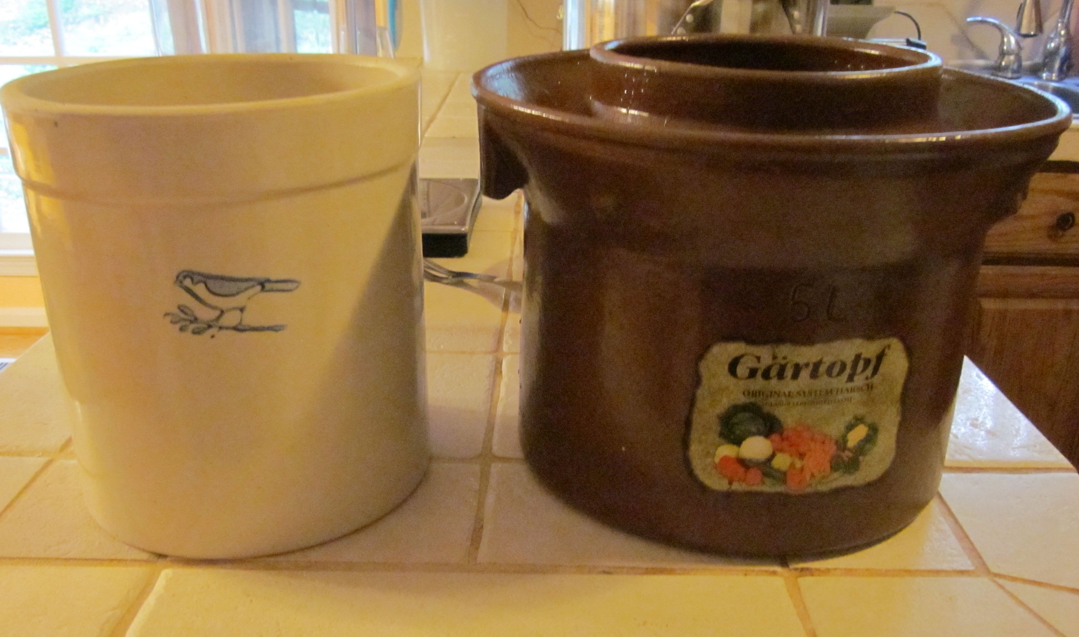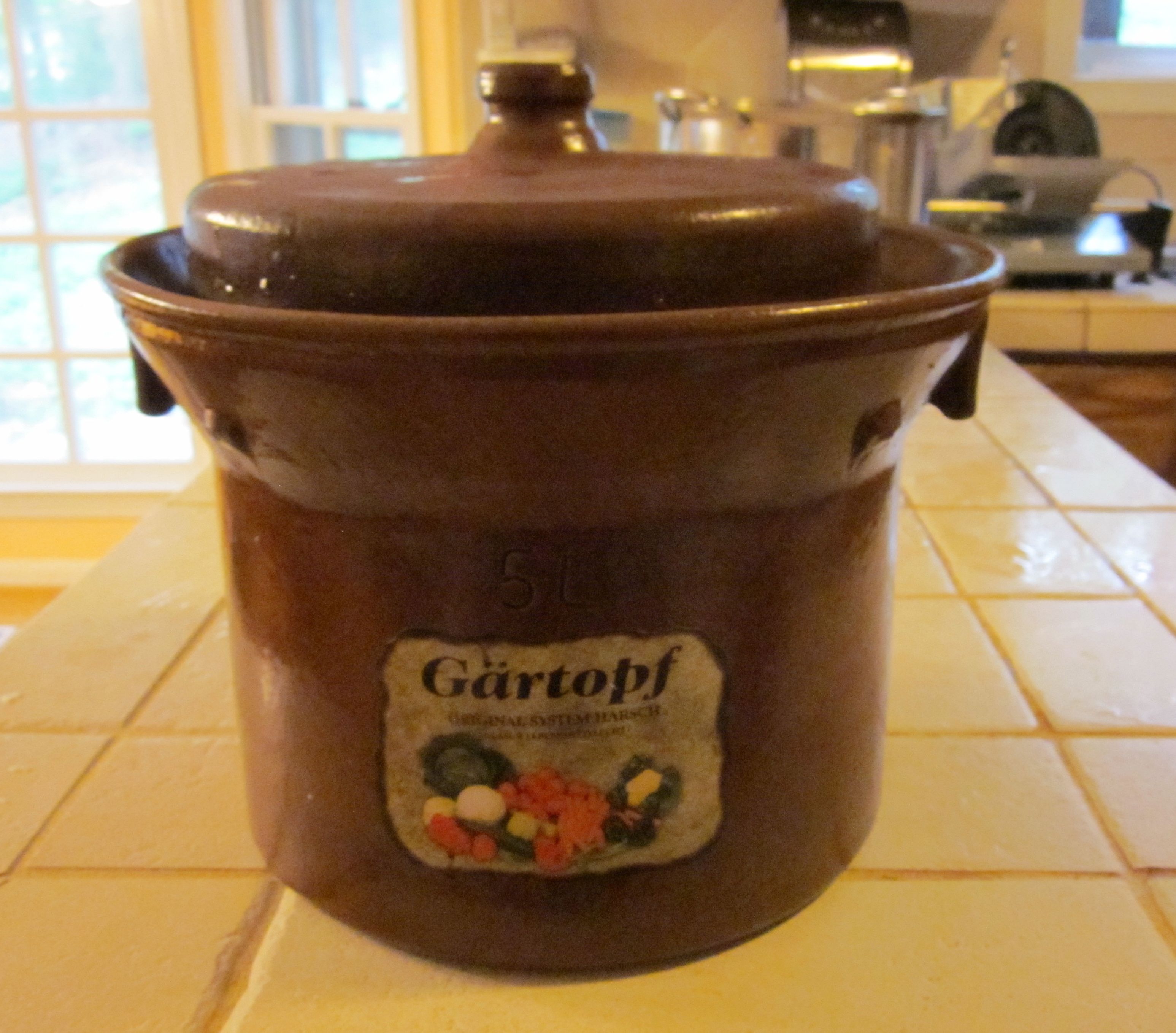 I use a 5 liter Harsch fermenting crock (on the right). You can also use an open crock.