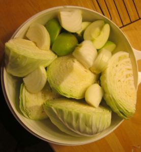 Clean and quarter the apples and onions. Slice the stem off the cabbage and remove outer leaves. Reserve a couple leaves for later. Quarter and core the cabbage; do not discard the core.