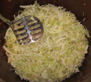 Place a large handful of cabbage in the crock and press down firmly with a potato masher or spoon. Keep adding handfuls of cabbage and pressing it down until all the vegetables are in the crock.