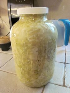 After 4 weeks has passed remove the lid. When you first remove the lid it might smell a little funny and the liquid will be cloudy. The important thing is that the vegetables still have a nice texture; not soft or squishy. Add the salt and vinegar storage ingredients to a one gallon jar. Remove the sauerkraut and place into your storage jar. Pour in the liquid from the crock. Cover and refrigerate. This lasts for months in the refrigerator.
