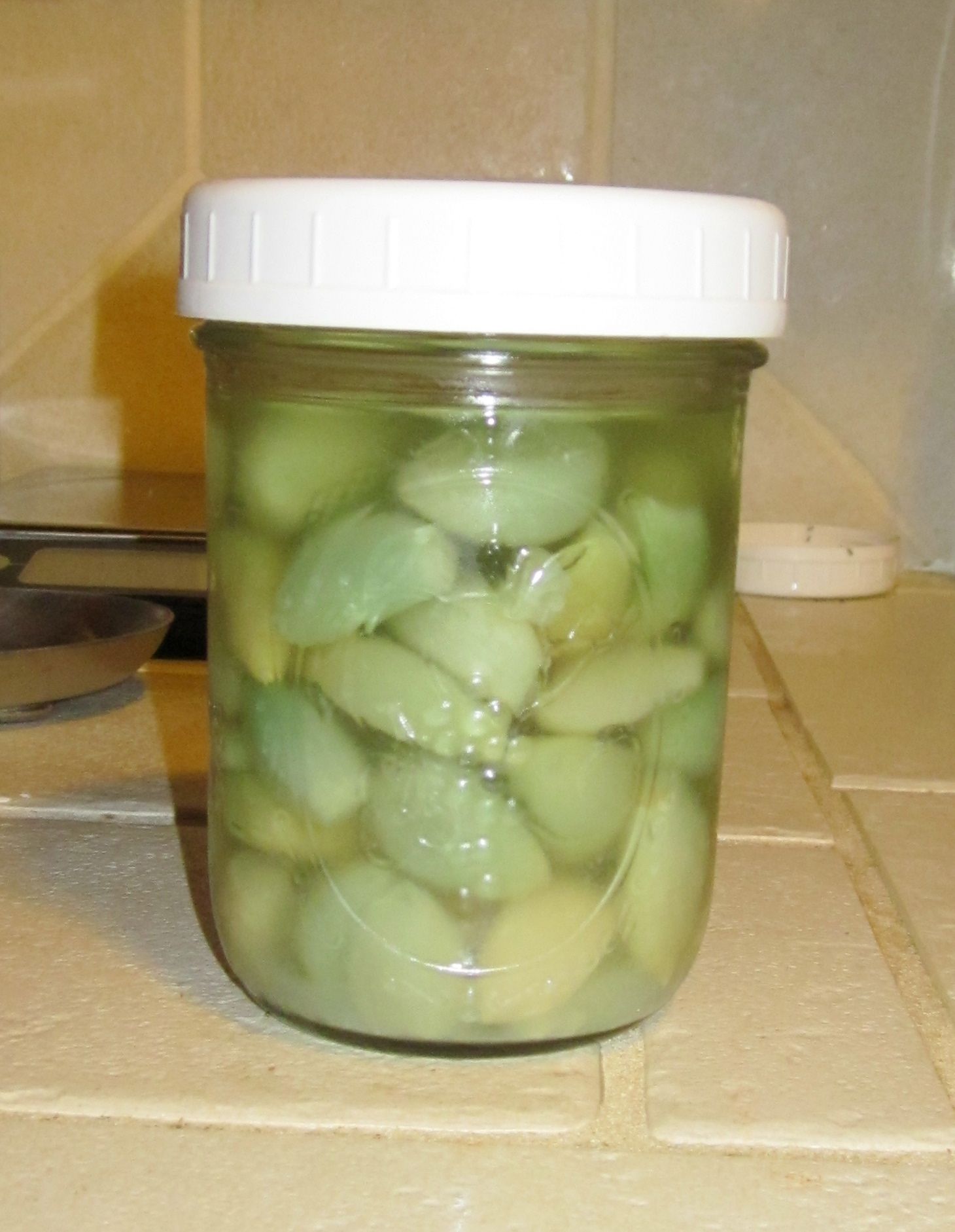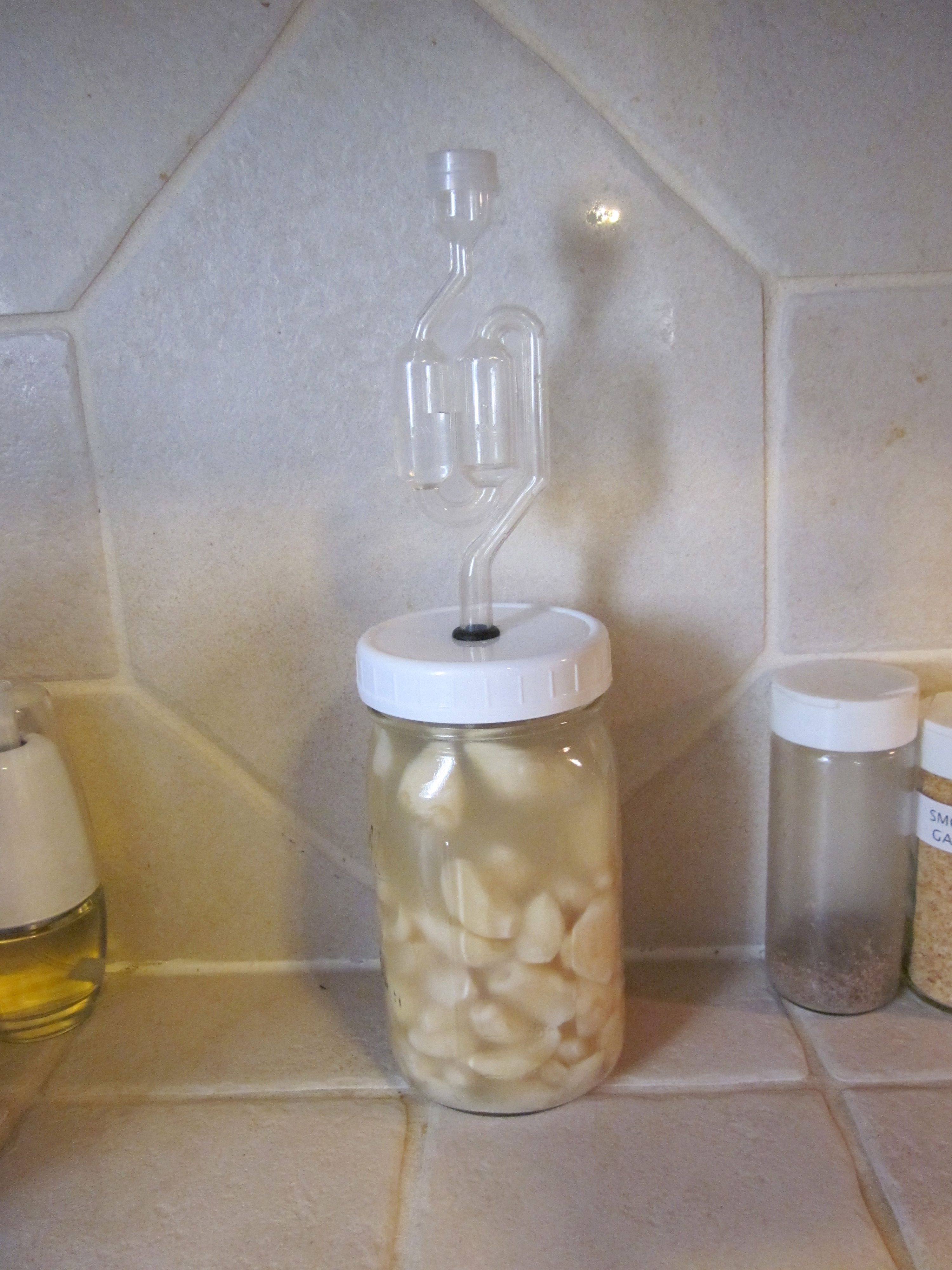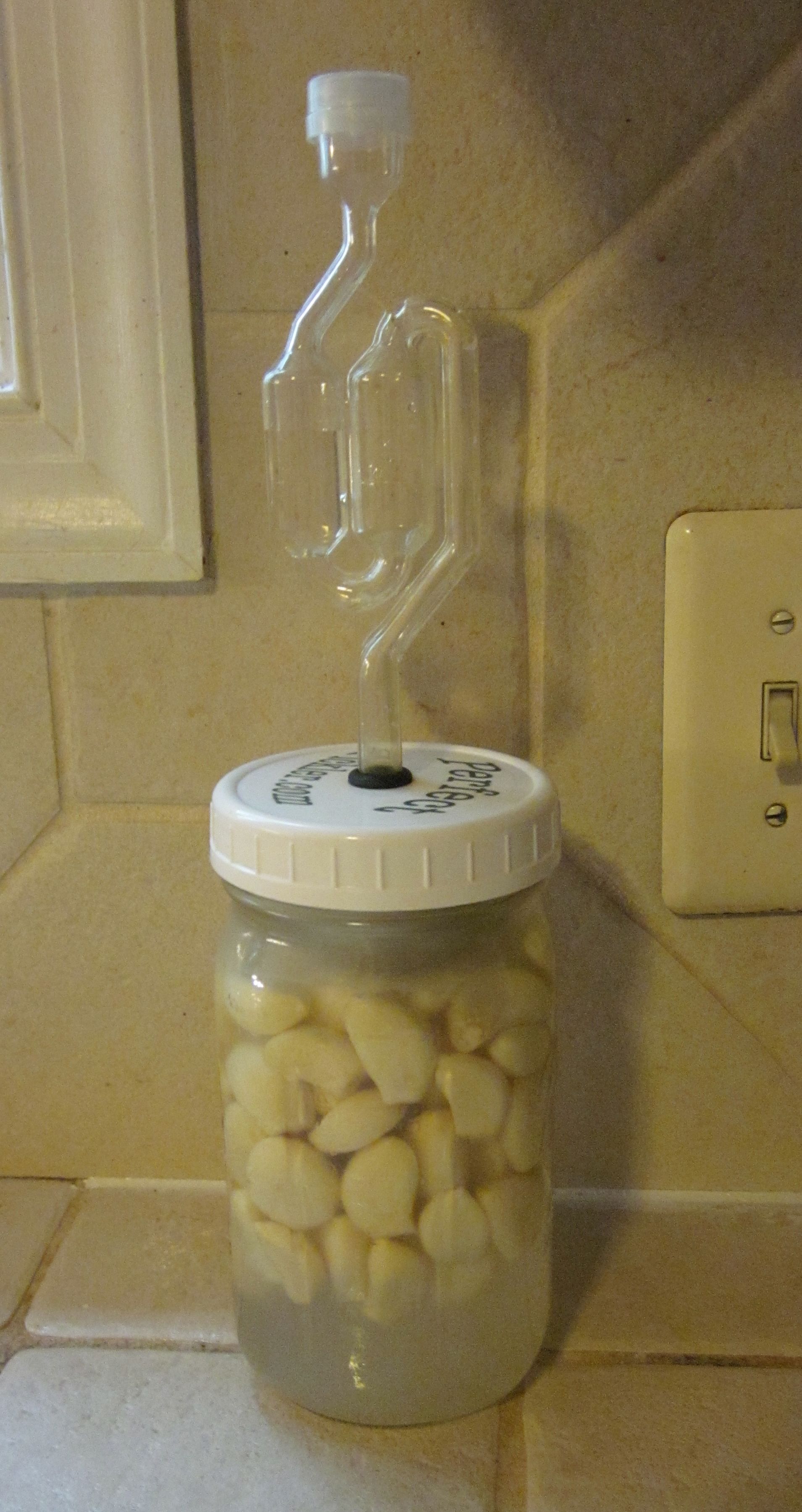 Place garlic, salt, and enough water to cover in 1 quart jar. Cover and set on counter. I use a canning jar and plastic lid. I also have an airlock and grommet that I purchased on eBay. It allows air to escape without letting air in. I think you can also loosen the cap every couple days to release the pressure. Here it is after 2 weeks.