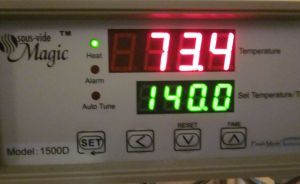 It takes maybe half an hour to set everything up. Once it’s cooking I can pretty much leave it (for a couple days if necessary). I have made mistakes here and there like forgetting to put the probe in the water and plugging the air pump into the SVM (both end up with the bags boiling). I have a permanent label on the Nesco cord and I try to keep a close eye on the probe now. One other time I let the air hoses drop down which created a siphon and a huge puddle on the floor. In spite of the learning curve (and stupid mistakes) it’s been fun to try.